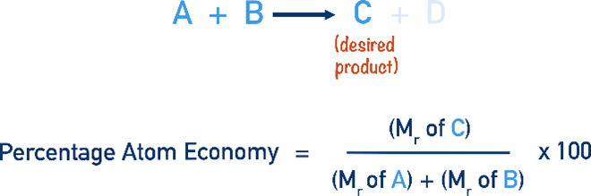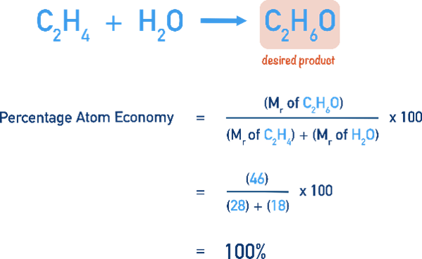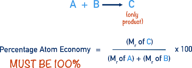 Jika, seperti yang terkadang terjadi, suatu reaksi hanya menghasilkan satu produk, ekonomi atomnya akan selalu 100% karena semua atom reaktan berakhir di satu-satunya produk! Misalnya, jika A + B bereaksi bersama dan hanya menghasilkan C, maka:
