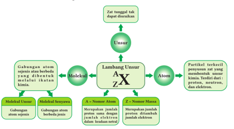 Dari Gambar 5 diketahui bahwa unsur merupakan zat tunggal yang tidak dapat diuraikan menjadi zat lainnya melalui reaksi kimia. Setiap unsur disusun dari gabungan atom sejenis. Sementara atom adalah unit terkecil dari suatu zat yang memiliki sifat kimia suatu unsur. Gabungan atom sejenis akan membentuk molekul unsur misalnya gas Oksigen (O2) ozon (O3) gas hidrogen (H2) gas klorin (Cl2) dan gas nitrogen (N2). Adapun gabungan atom yang berbeda akan menghasilkan molekul senyawa antara lain gas karbon dioksida (CO2) air (H2O) dan glukosa (C6H12O6). Molekul unsur dan molekul senyawa yang bereaksi dapat dibaca maupun tulis dalam suatu persamaan reaksi kimia.