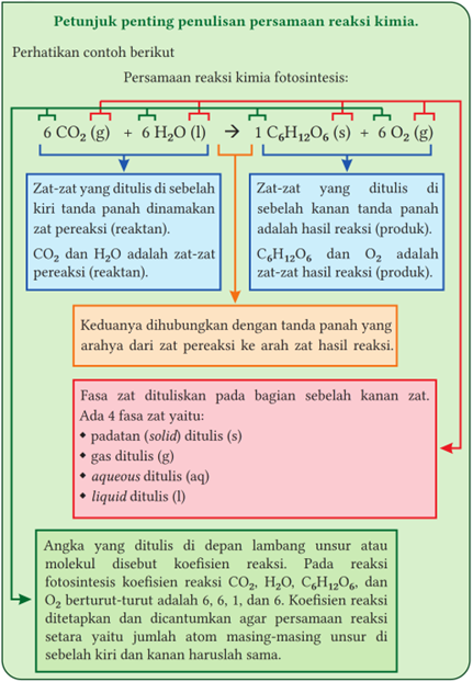 Hal ketiga yaitu mengenal bahwa reaksi kimia merupakan proses perubahan yang terjadi bila satu senyawa berubah atau bereaksi dengan senyawa atau unsur lain, menghasilkan senyawa atau unsur yang baru. Secara molekuler proses kimia selalu disimbolkan dengan persamaan reaksi. Untuk lebih jelasnya, silakan Kalian lihat petunjuk penting dalam menuliskan persamaan reaksi kimia yang ada pada infografis Intisari berikut