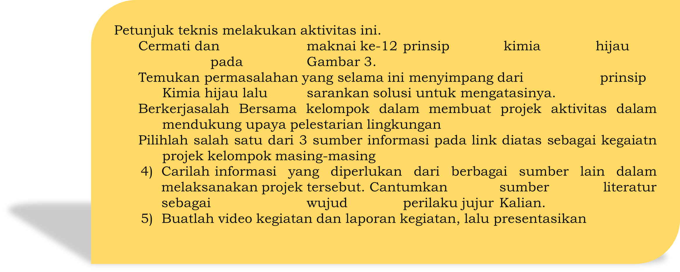 Prinsip kimia hijau sangat memberikan kontribusi terhadap pelestarian lingkungan. Dalam aktivitas selanjutnya, Kalian akan merancang, mengembangkan, dan mempraktikkan prinsip yang lebih hijau untuk pelestarian lingkungan. Lakukan Aktivitas 3 untuk mengenal prinsip kimia hijau. Analisis lebih dahulu apa dan bagaimana prinsip kimia hijau itu dengan mencermati infografis yang disajikan pada Gambar 3