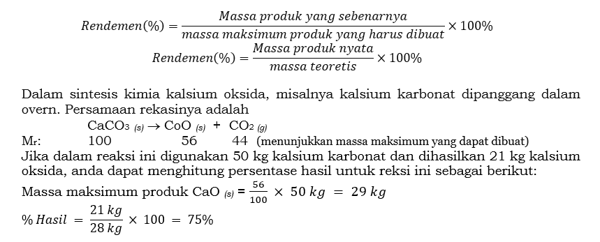Sering kali, reaksi tidak hanya menghasilkan produk yang diinginkan, tetapi juga produk 'limbah' lainnya. Dengan menggabungkan massa relatif (Mr) semua reaktan dan membandingkannya dengan massa relatif produk yang diinginkan, kita dapat mengetahui berapa banyak reaktan yang 'berakhir' dalam produk yang diinginkan. Untuk mempermudah, kita nyatakan perbandingan tersebut dalam bentuk persentase. Perbandingan ini dihitung menggunakan rumus: